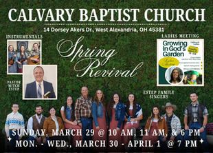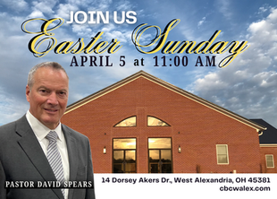 We are located at 14 Dorsey Akers Dr. which is just outside of West Alexandria, Calvary Baptist Church exists to lift up and exalt our Lord and Savior Jesus Christ. We are dedicated to spreading the Gospel of Jesus Christ, and our goal is to fulfill our part of the Great Commission. We invite you to become a part of our growing congregation, and look forward to meeting you! All are welcome and invited. Pastor David Spears